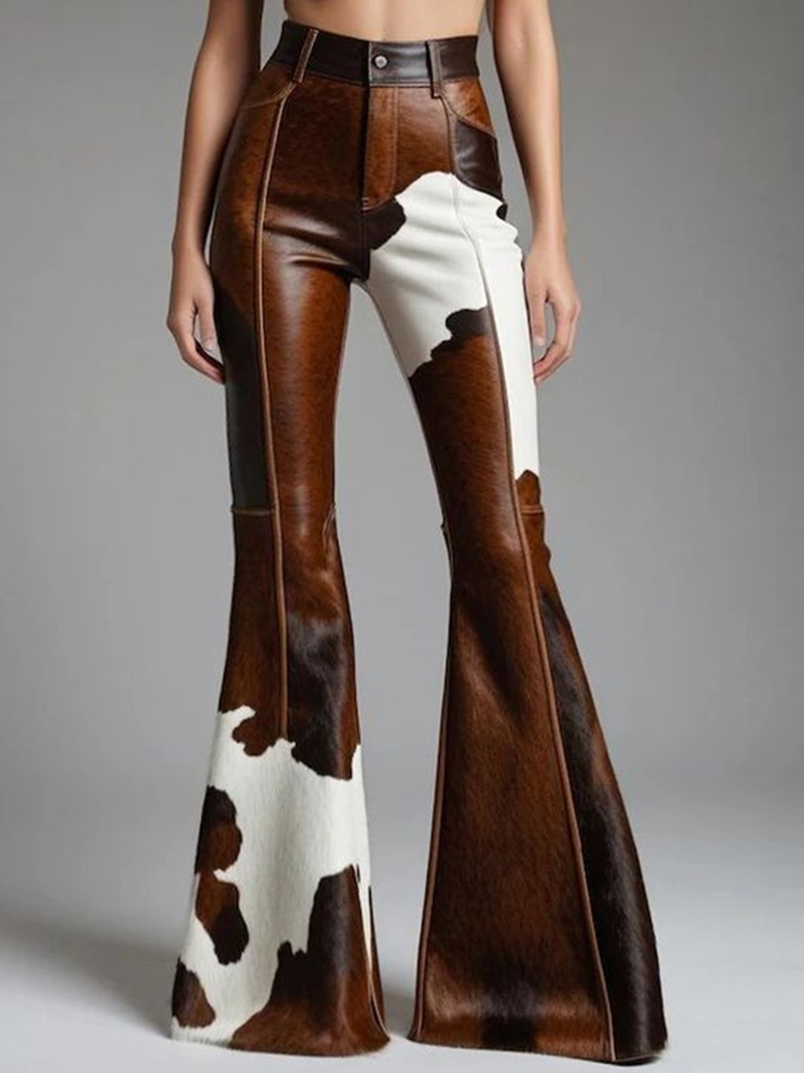 Western Cow Pattern PU Leather High Waist Bell Bottom Pants