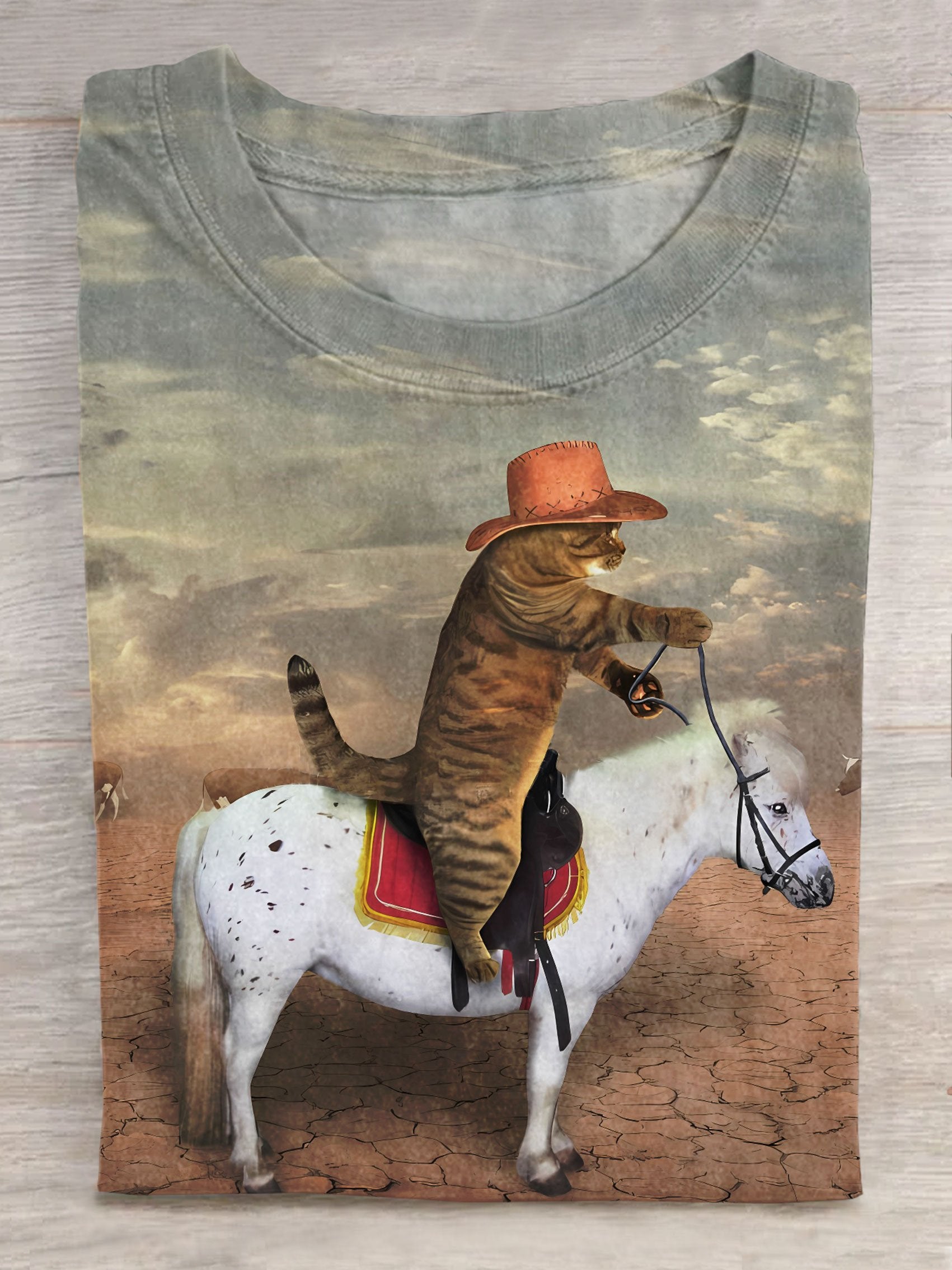 Unisex Funny Cat Ride Horse Cowboy Art Print Casual T-shirt