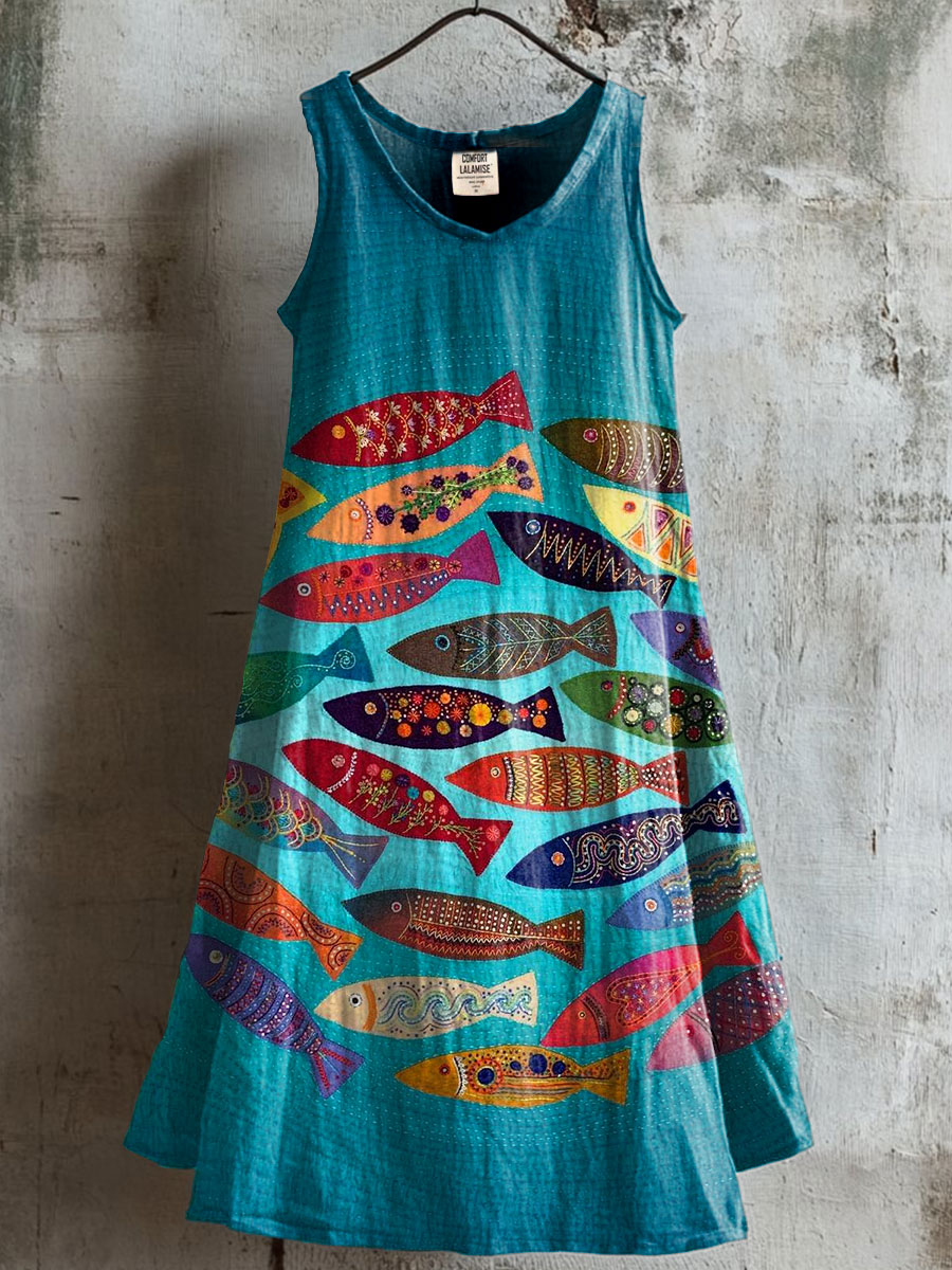 Women's Vintage Fish Print V-neck Pocket Cotton Dress