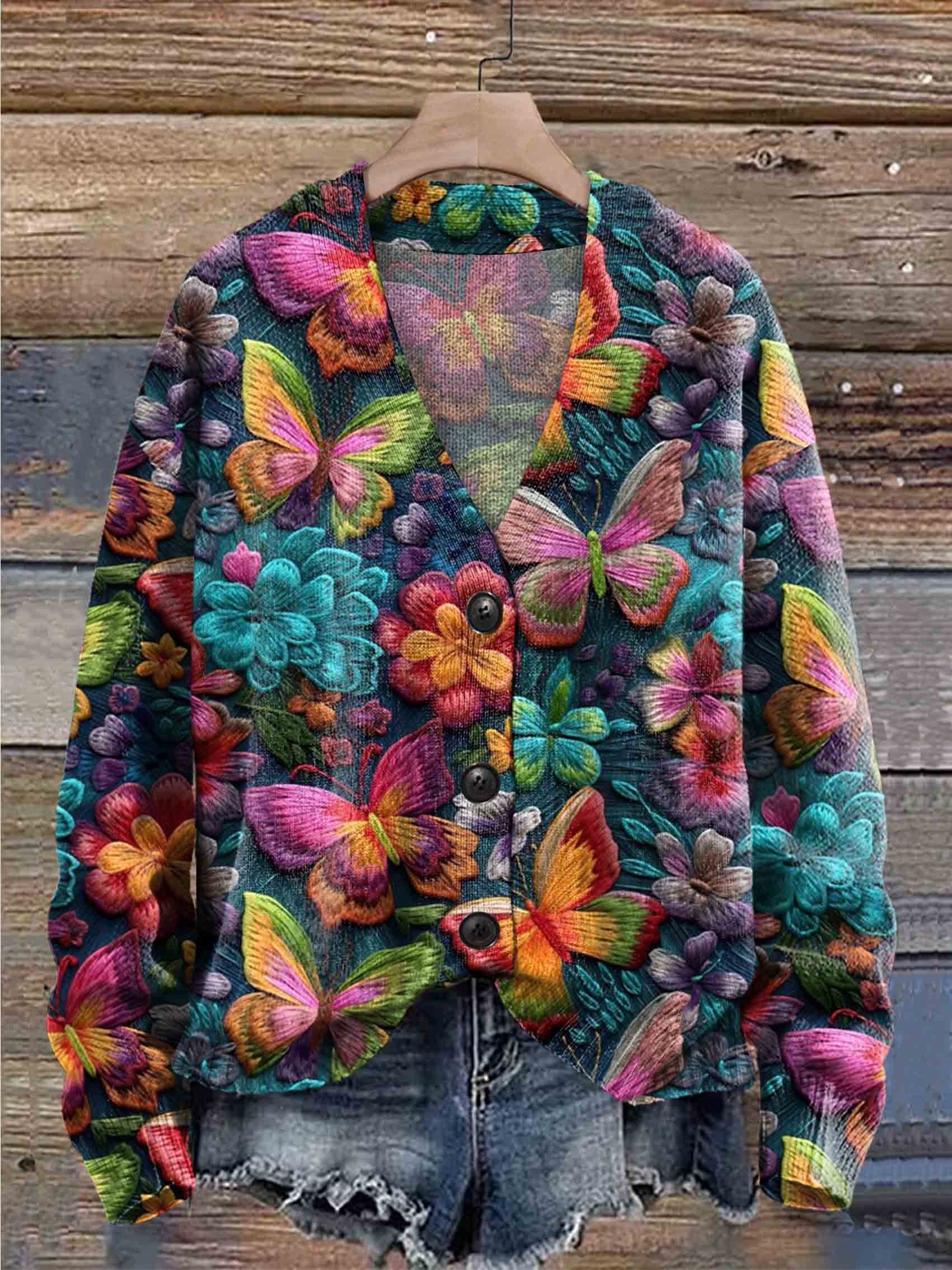 Butterfly &Flowers Print Buttoned V-neck Cardigan Sweater