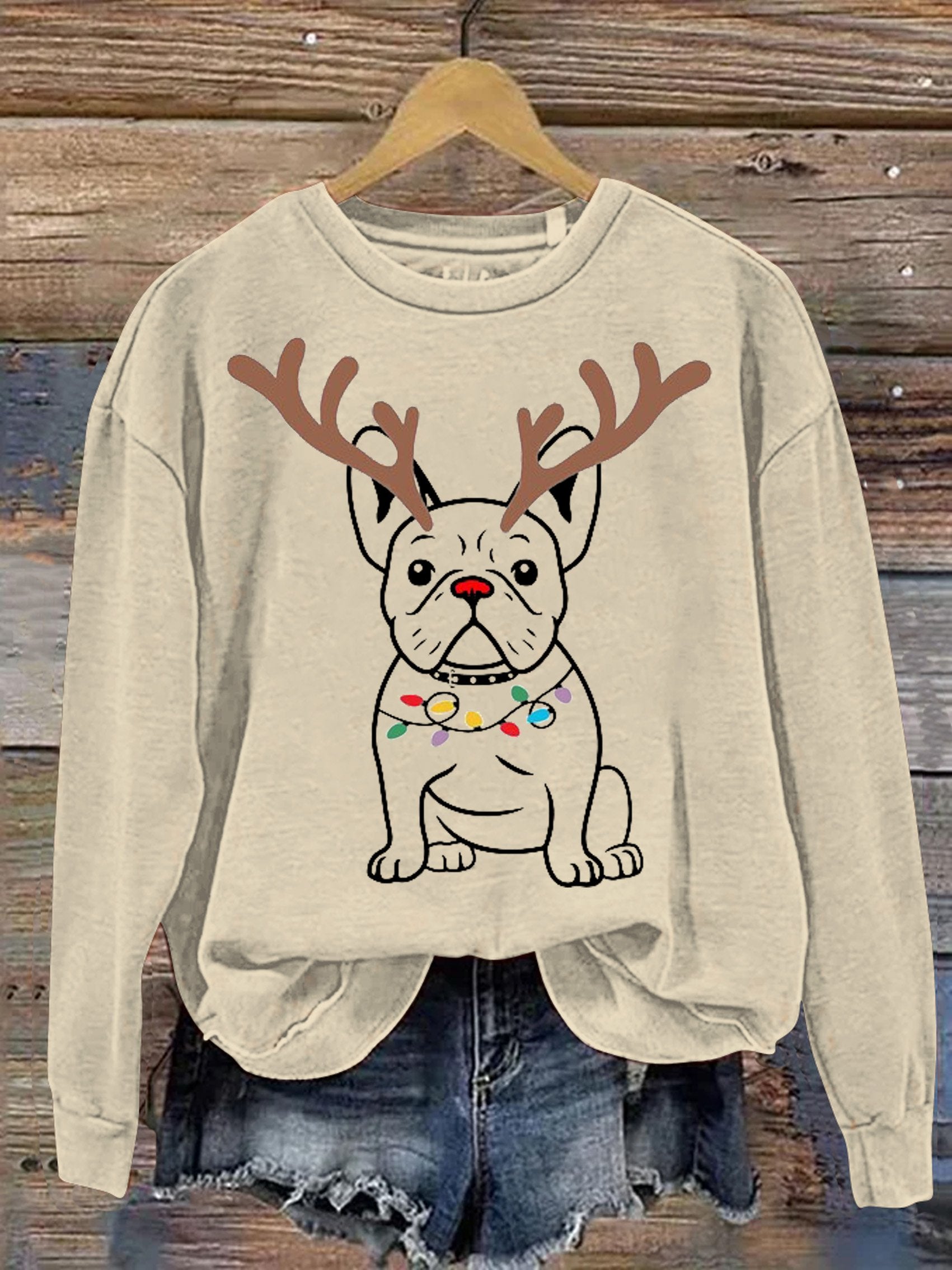 Christmas Animal Bulldog Lanterns Print Casual Sweatshirt