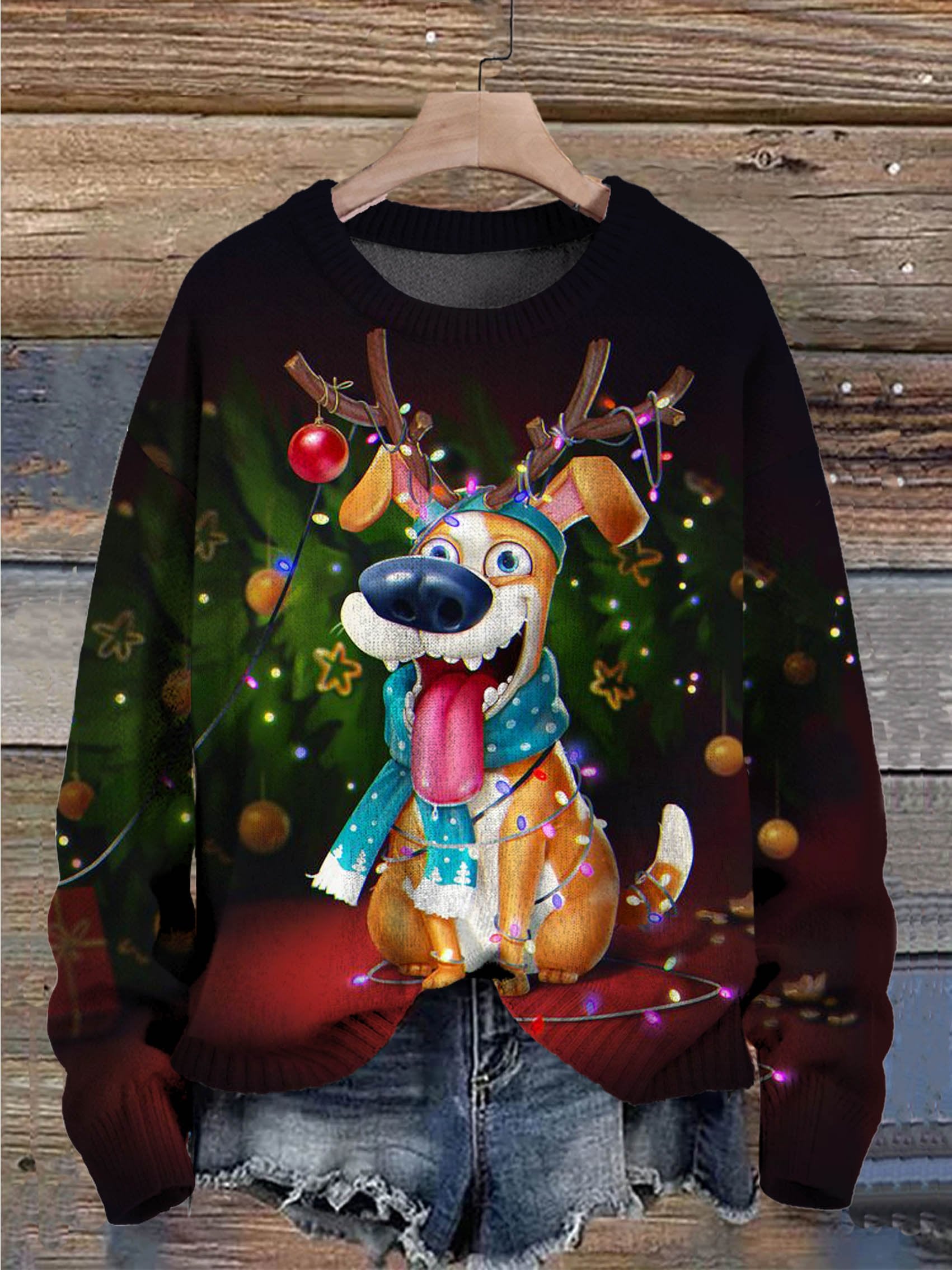 Christmas Funny Dog Decorations Art Print Casual Knit Pullover Sweater