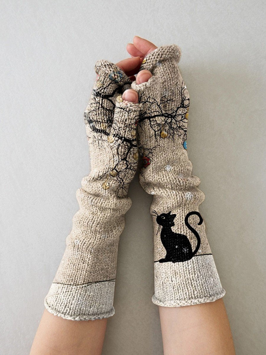 Christmas Retro Cat Bells Print Knit Fingerless Gloves