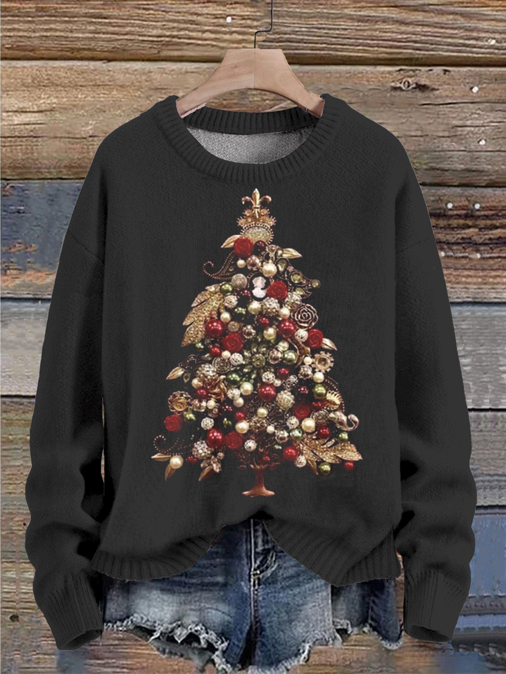 Christmas Tree Jewelry Art Pearls Print Knit Pullover Sweater