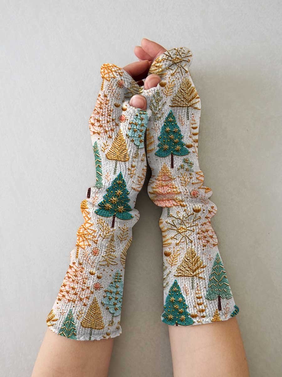 Christmas Tree Print Casual Knit Gloves, Leg Sets,Hat