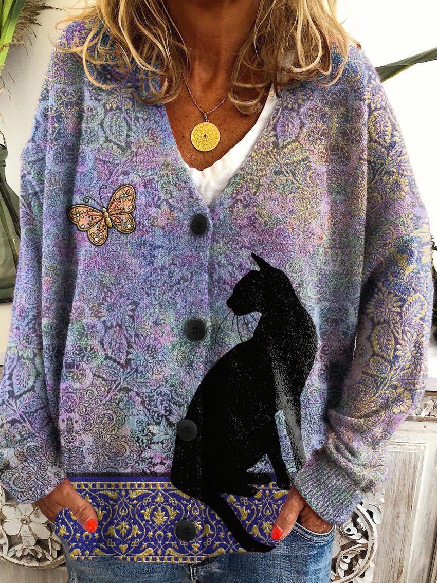 Cute Black Cat Butterfly Ethnic Art Pattern Print Buttoned Cardigan Sweater