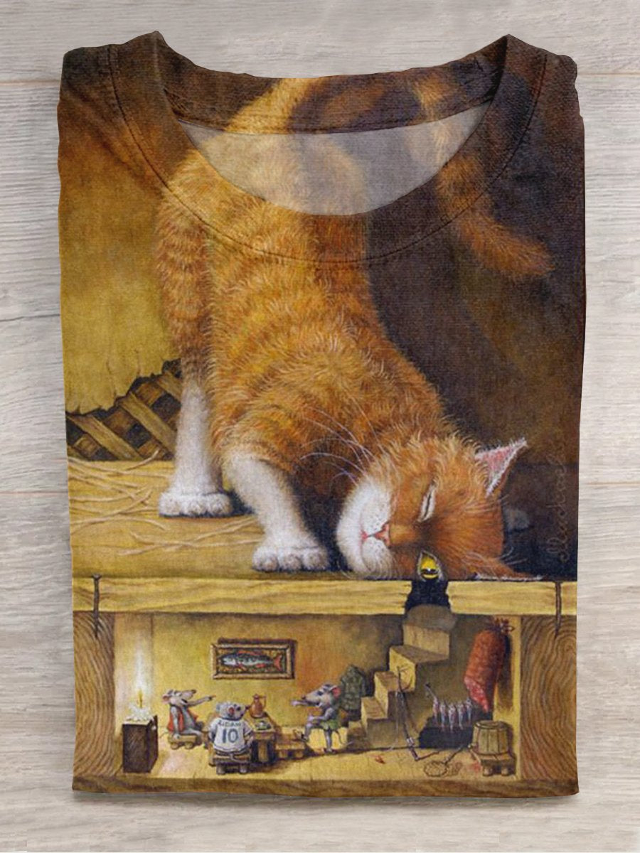 Cute Cat Peeks At Mouse Kitten Casual Print T-shirt