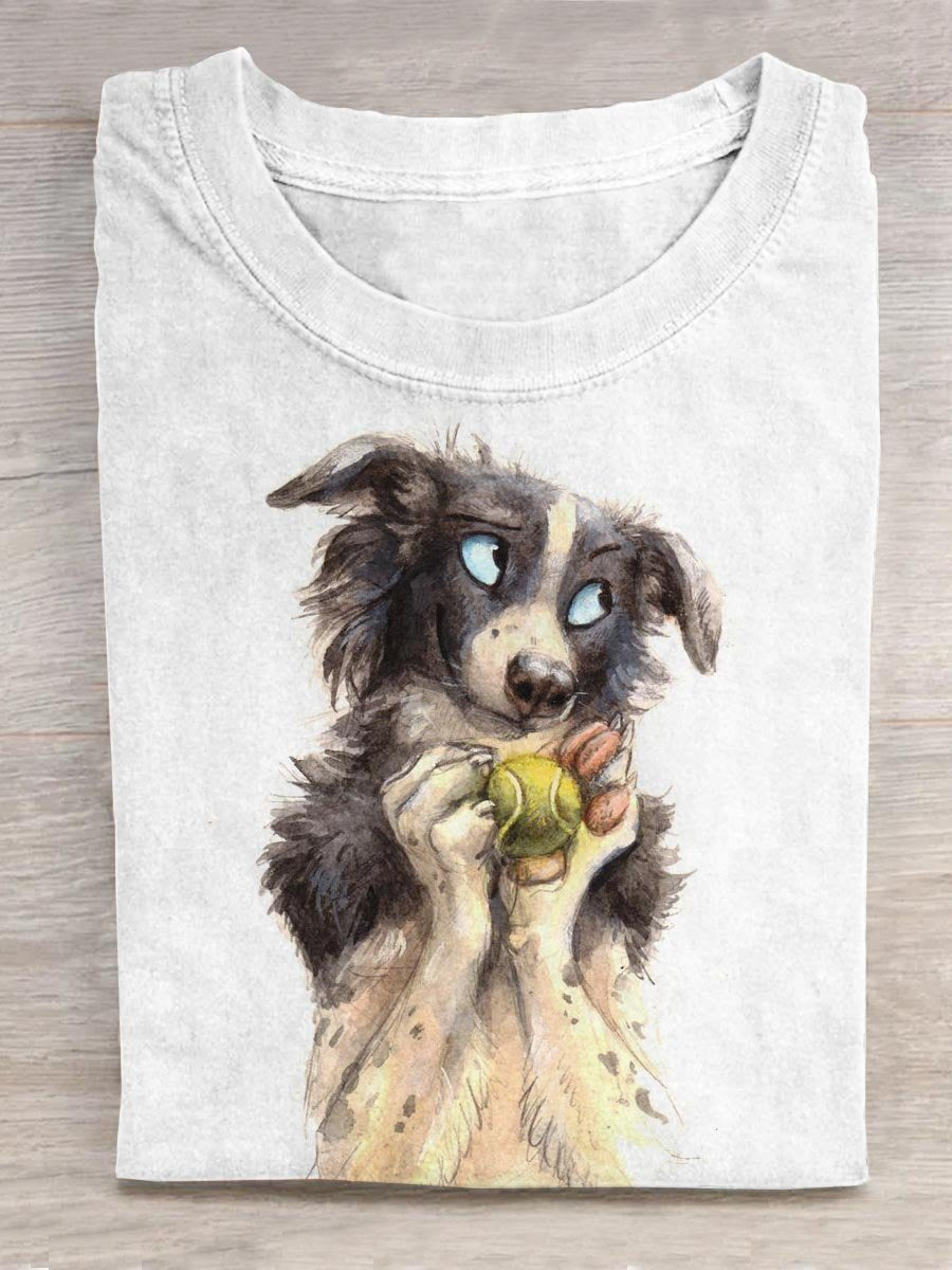 Cute Dog Plays Tennis Art Print Casual T-shirt