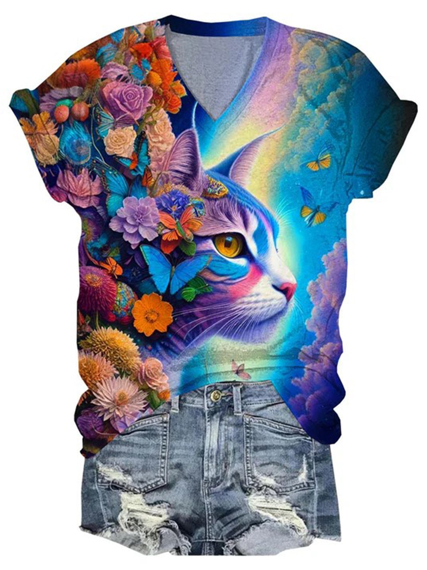 Fantasy Clouds Cat Butterfly Flower Retro Pattern Casual Print T-shirt