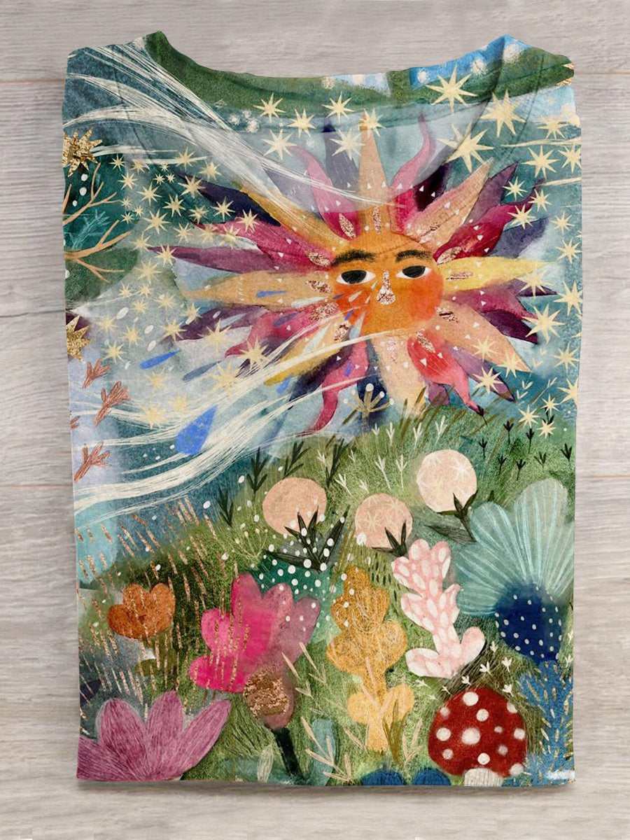 Fantasy Style Sun And Nature Illustration Printed T-shirt