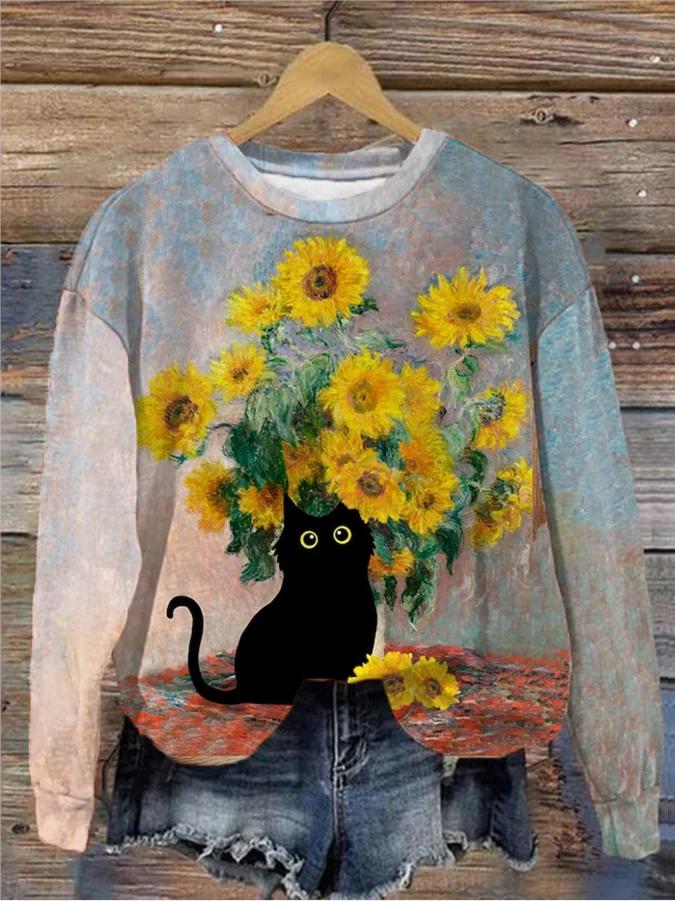 Funny Black Cat Sunflower Art Pattern Print Casual Sweatshirt