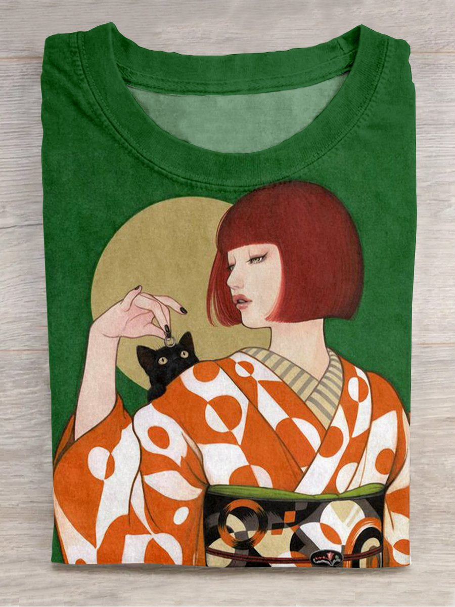 Funny Cat Japanese Style Illustration Animal Art Casual Print T-shirt