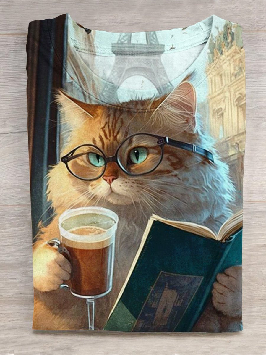 Funny Cat Reading Art Pattern Print Casual T-shirt