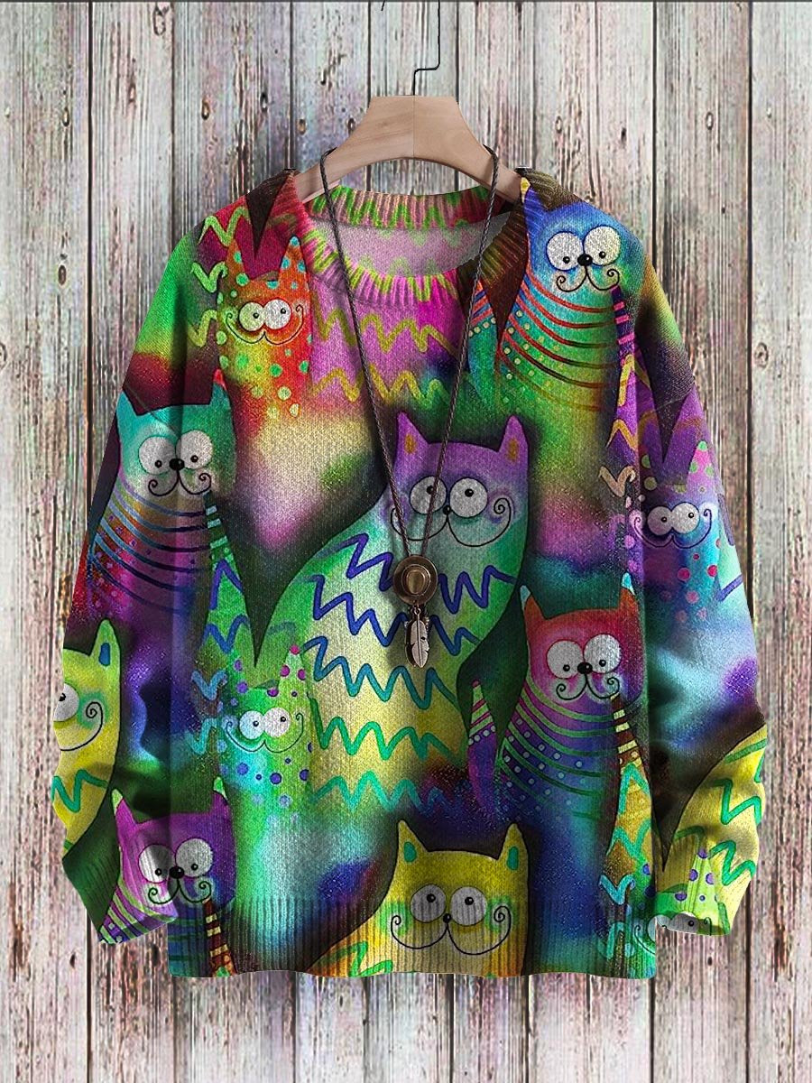 Funny Colorful Cats Art Pattern Print Casual Knit Pullover Sweater