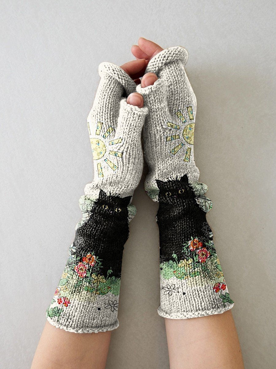 Knit Vintage Black Cat Flower Art Printing Fingerless Gloves