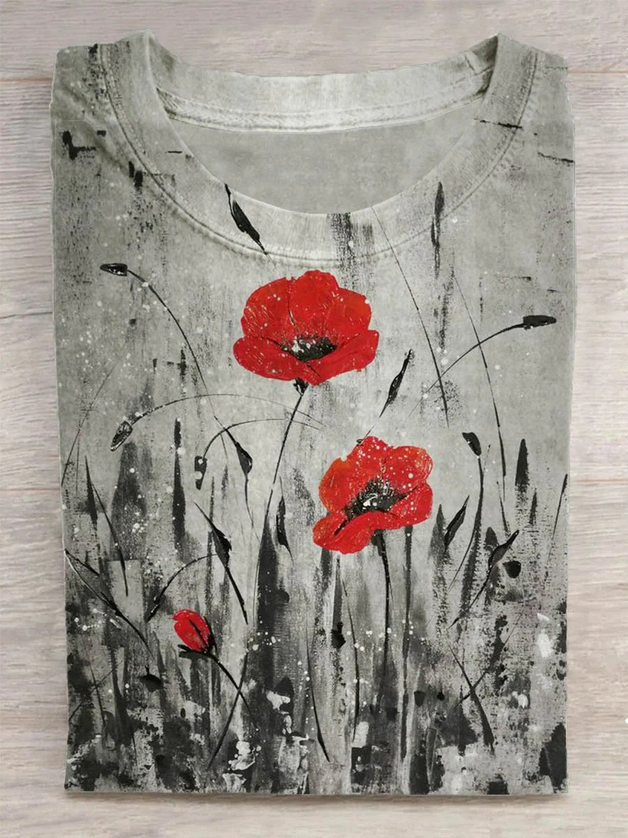 Retro Poppy Flowers Art Pattern Print Casual T-shirt