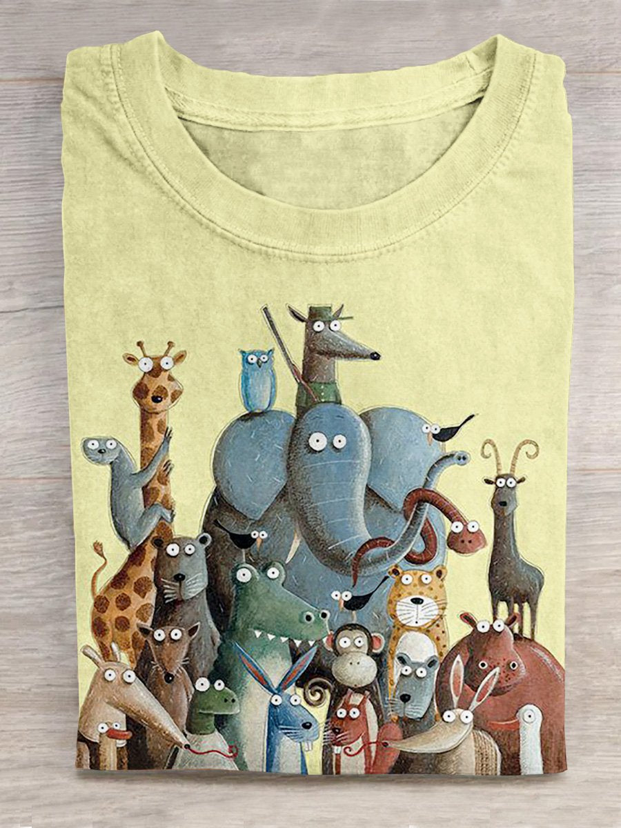 Suprised Zoo Animals Gathering And Gazing Illustration Printed T-shirt