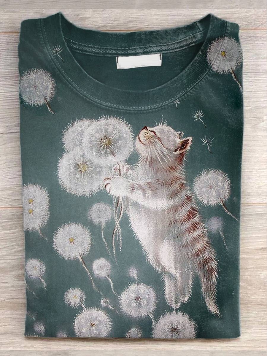 Unisex Funny Cat Illustration Printed Casual Round Neck T-Shirt
