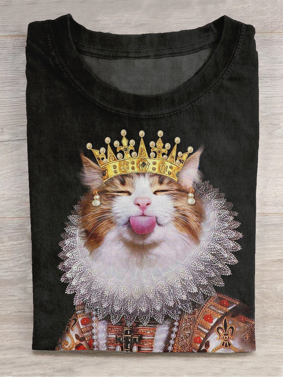 Unisex Tongue-Out Cat Art Print Crew Neck Short-Sleeved T-Shirt