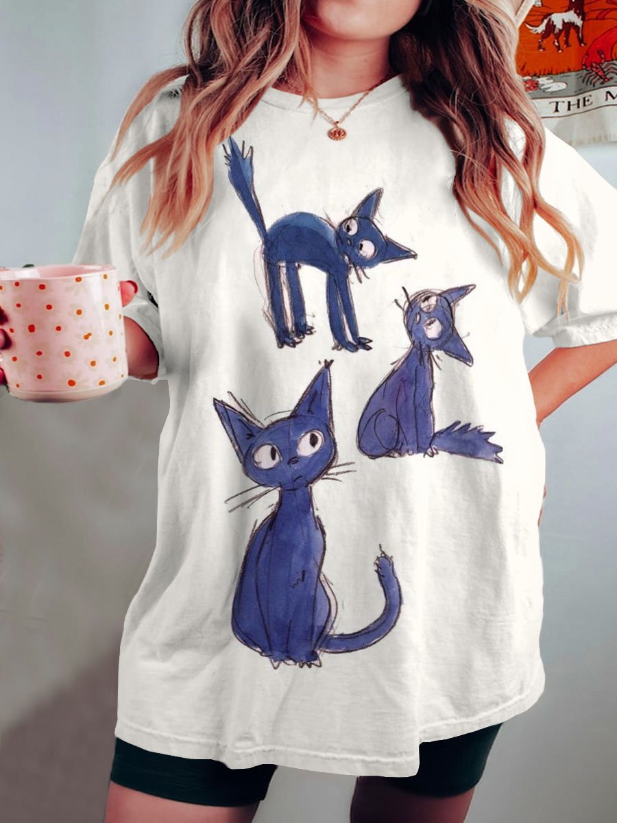 Women's Cat Art Print Crew Neck Causl Shirt