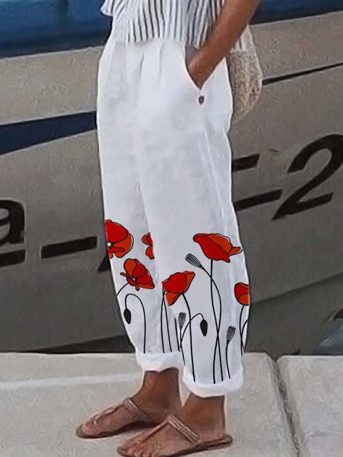 Women's Floral Print Simple Cotton Linen Casual Pants