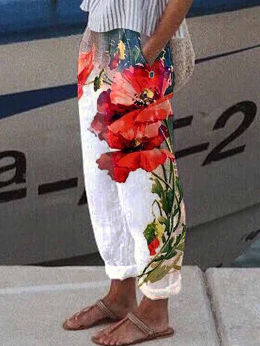 Women's Flower Printed Pocket Casual Pants