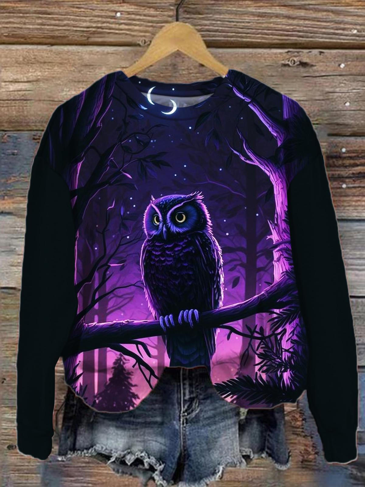 Women's Owl Print Round Neck Long Sleeve Top