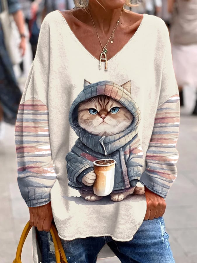 Women's Winter Funny Cute Wonderland Clothing Cat Coffee Printed V-Neck Long Sleeve Top