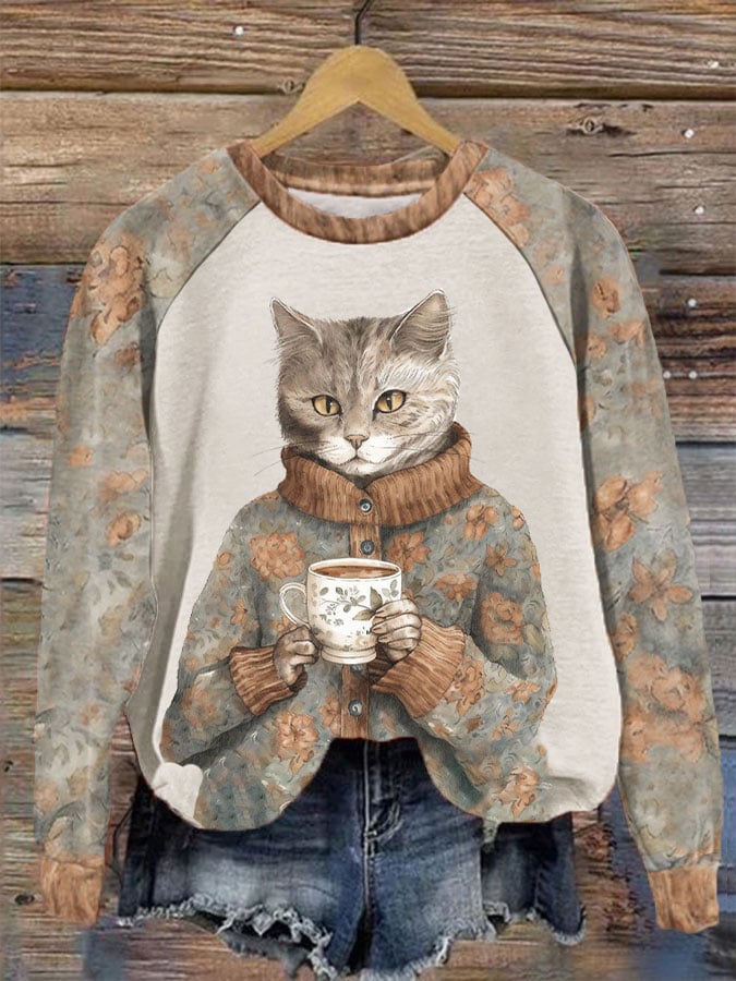 Women's Winter Funny Cute Wonderland Clothing Floral Cat Printed Sweatshirt